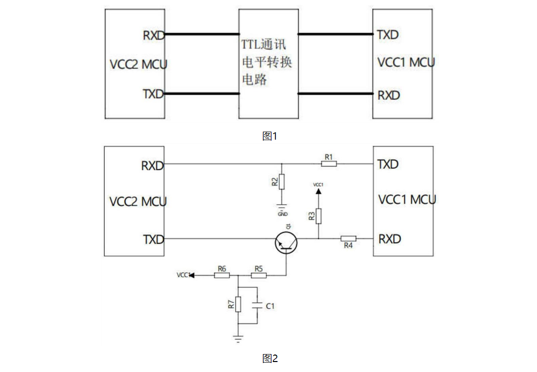 本實(shí)用新型公開一種TTL通訊電平轉(zhuǎn)換電路,用于實(shí)現(xiàn)第一MCU與第二MCU之間的通信,且第一MCU的工作電源為VCC1,第二MCU的工作電源為VCC2;TTL通訊電平轉(zhuǎn)換電路包括電阻R1、電阻R2、電阻R3、電阻R4、電阻R6、電阻R7、三極管Q1;電阻R1一端連接第一MCU的TXD端,另一端經(jīng)電阻R2接地,且電阻R1和電阻R2彼此的節(jié)點(diǎn)連接第二MCU的RXD端;電阻R3一端連接VCC1,另一端連接電阻R4的一端及三極管Q1的集電極;三極管Q1的發(fā)射極連接第二MCU的TXD端,電阻R4的另一端連接第一MCU的RXD端;電阻R6一端連接VCC1,另一端經(jīng)電阻R7接地,且電阻R6和電阻R7彼此的節(jié)點(diǎn)連接三極管Q1的基極。本實(shí)用新型結(jié)構(gòu)簡單、轉(zhuǎn)換準(zhǔn)確性高,采用較低的成本可以實(shí)現(xiàn)電平轉(zhuǎn)換的目的,同時(shí)增加了電路的穩(wěn)定性。
