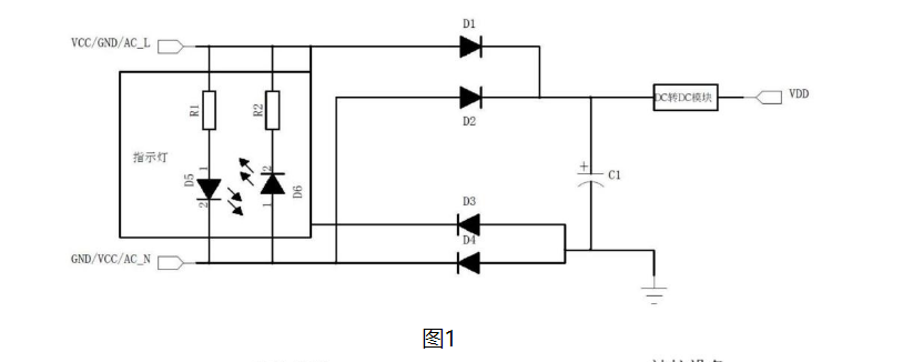 | 圖1為本實用新型實施例提供的無極性電源輸入電路的原理圖。 |