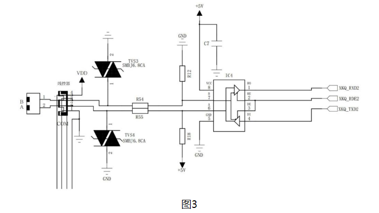 | 圖3為本實用新型實施例提供的線控裝置中所采用的485通訊電路的原理圖。 |